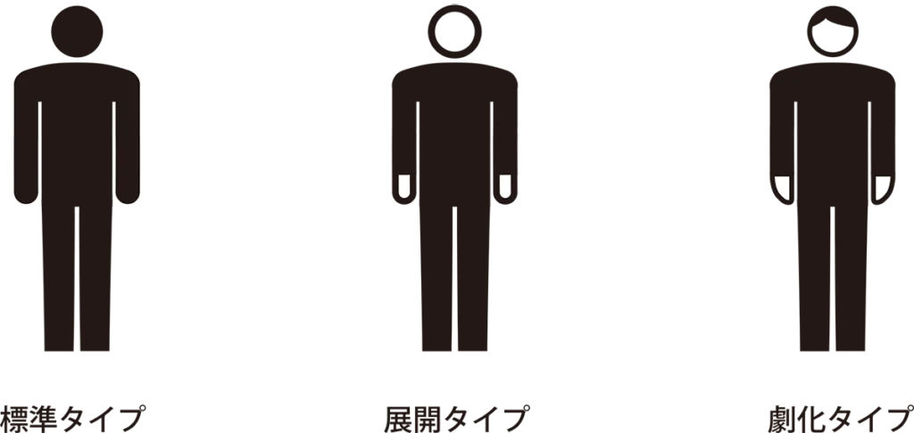 3つのタイプの大きな違いは、頭部と腕先の処理にある。展開タイプ、劇化タイプはいずれも白い頭部と腕先を有しているが、劇化タイプには頭髪が加えられ、手先の表現にはニュアンスを持たせている。また、劇化については、モドレイのピクトグラムがそうであったようにマンガ表現を念頭において、ポーズに応じて微妙な曲線処理を加えることとした。