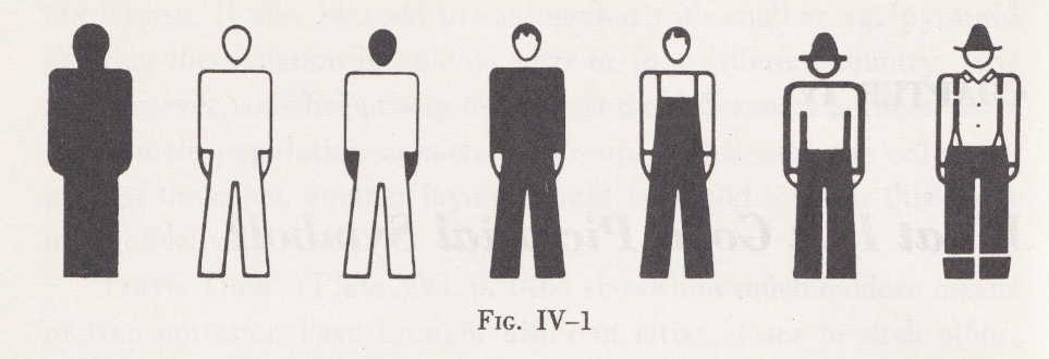 次に考察の方針についてである。人型ピクトグラムの大まかな構成を考えるうえで手がかりとなるのが、彼が作成したピクトグラム一覧の図(図2)である[注6]。この図では、抽象的ピクトグラムの事例としてアイソタイプが左端に置かれているが、それ以外はモドレイが作成したピクトグラムである。右側にはより具体的で個別的な人型を表すピクトグラムが配置されていることから、この図は一般性・抽象性と個別性・具象性を両極とするピクトグラムのスペクトラムを表していると考えられる。この図の詳細については後で論じるが、ここで注目されるのが、この図の中央に置かれたピクトグラム群(左2つ目から5つ目までの4つ)である。それらはアイソタイプとも、また右端のふたつのピクトグラムともその形状があきらかに異なっており、スペクトラムの中間に位置する基本的な形態であると推定できる。したがって、まず解明すべきなのは、この「基本的な」ピクトグラムのあり方である。