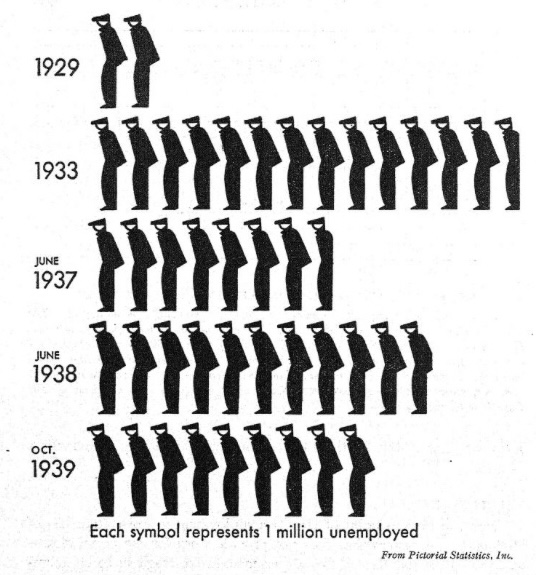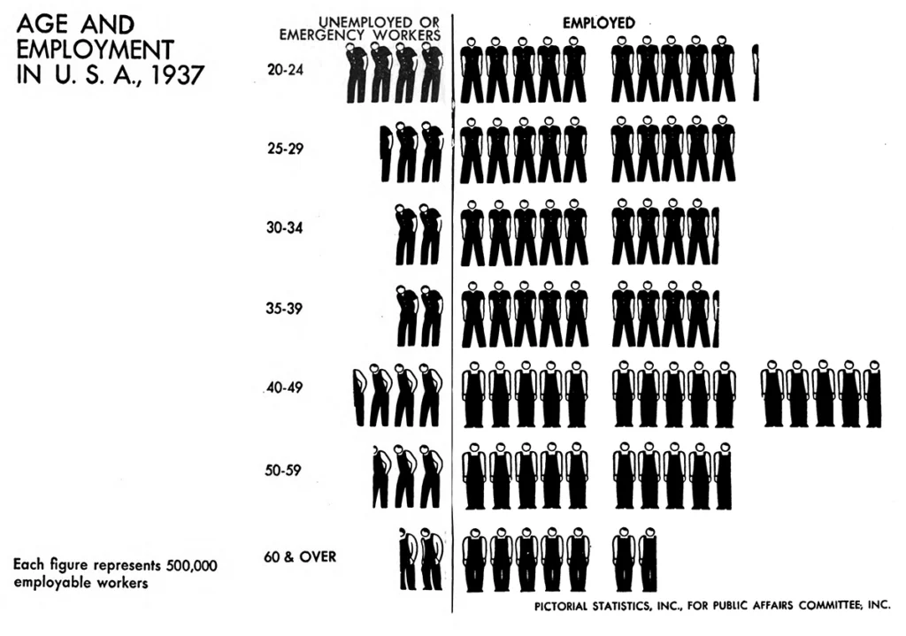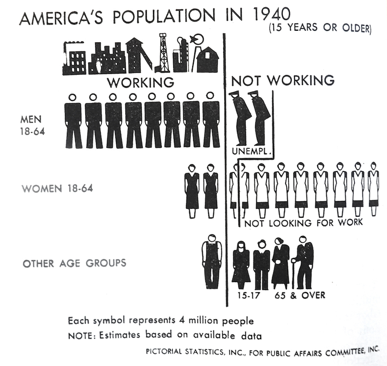 多数のピクトグラムを用いて多項目を示した他の事例として挙げられるのが、図19、20である。「アメリカの人口」と題する就業状態で大きく人口を二分した図19のチャートでは男性、女性、それに高齢者を含んだ「その他」の三区分でまとめられ、全体が合計9種類の人型ピクトグラムで表現されている。このチャートでは、男性就業者と女性就業者、女性の失業者に標準ピクトグラムが用いられているが、男性就業者については、頭部のみ円形に変えられている。これはおそらく失業者のピクトグラムと調和させるためと考えられる。女性の失業者(含む自発的)については家事専業を示すエプロンで示され、「その他」は図18でも見られた老齢の労働者、老夫婦、青少年で構成されている。この複雑な事例はピクトグラムの下に文字が付加されていることからも分かるように、ピクトグラム単独での意味伝達の難しさを自ら示している。問題は他にもあり、本来側面像であるべき女性の失業者が、家事専業を示すピクトグラムで代表されており、女性の職種や就業状態を表すピクトグラムが男性と比較してあきらかに不十分である。そのことも含め全体的にピクトグラムの統一性がうまく取れているとは言いがたい。