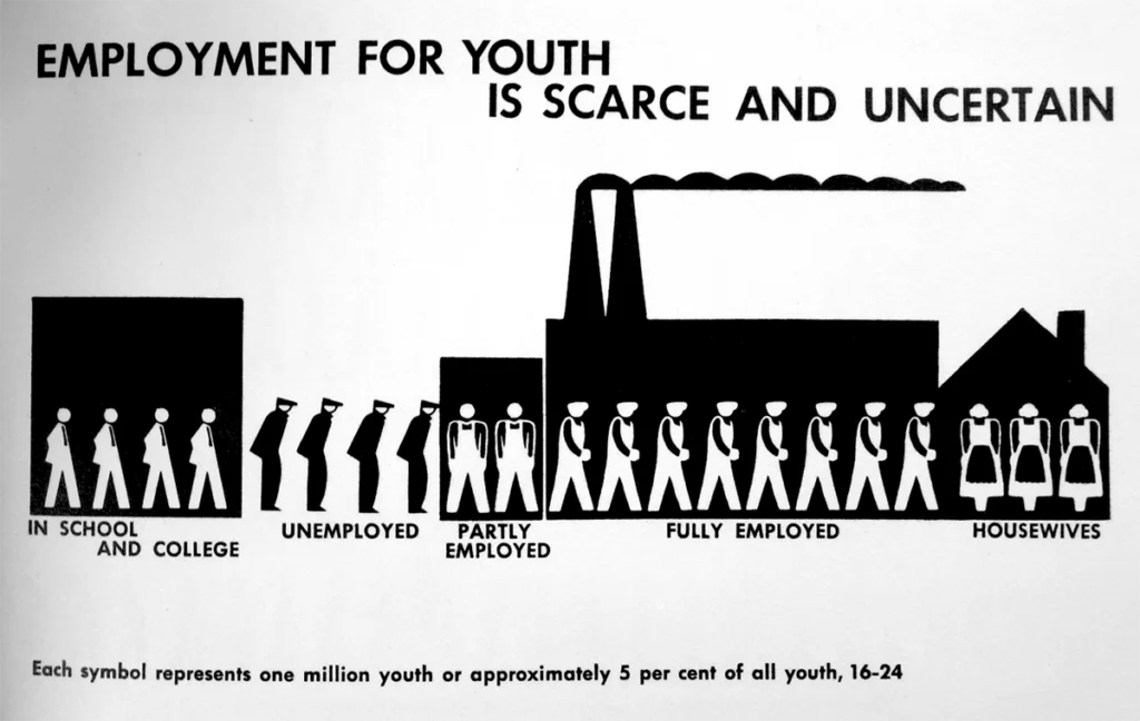 最後のチャート(図20)は、若者の就職の困難さを示した図である。この図では、就学生、失業者、部分雇用、完全雇用、家事従事といった職業に関するカテゴリーがピクトグラムで表現されている。ここでも、正面像と側面像の使い分けに一貫性が欠如しており、部分雇用を正面像で、完全雇用を側面像で示す理由は明確ではない。これらはおそらくは既出のピクトグラムを用いて細かな種別を表現する場合に生じる問題であろう。