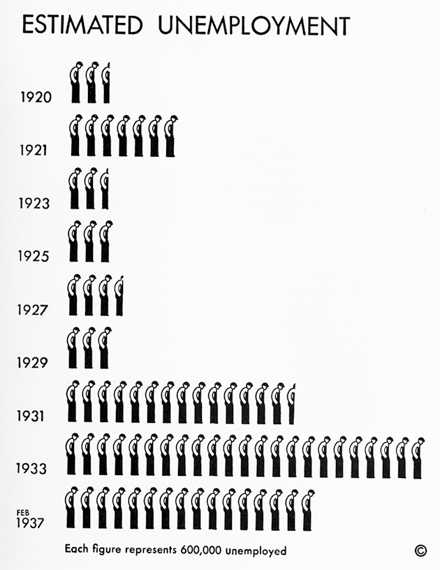 本節では、そのために同時代を特徴づける代表的なチャートのひとつである失業・雇用状態を扱ったものを取り上げる。図13はPSに掲載された失業・雇用状態を示すピクトグラム群である。まず図14で示すように失業者については標準的ピクトグラムが存在していたにもかかわらず、それとは別に独自に制作されたものがあったことを確認しておく。この独自制作の失業ピクトグラムは1939年頃に制作され、結果として標準的ピクトグラムを用いたチャート(図15)と、独自のピクトグラムを用いたチャート(図16)とが併存していた。独自制作のピクトグラムのデザインは標準的ピクトグラムと比べ幾何学的性質が弱められており、図13に見られる他のピクトグラムと親和性を高めている。他方で、図13には明らかに幾何学的性質の強い失業者を表すピクトグラムも認められる。下列中央に置かれたピクトグラムがそれである。この用例として図17のチャートの存在を確認したが、工場での機械的労働を示すピクトグラムとセットで用いられており、他の用例は確認できていない。図17は「テレファクト(Telefact)」という日刊新聞用の配給カットとして制作された図像統計[注21]で、新聞紙上におけるカットという条件ゆえに、より単純明快なピクトグラムの必要性からデザインされたものかもしれない。あるいは単に担当デザイナーの違いなどの別の要因もあったのかもしれない。いずれにしても、このピクトグラムと他のそれとの違いは様式的差異である。それに対して、それと明確に異なるあり方を示しているのが、図13に見られる微妙に姿勢の異なるピクトグラムである。これらのピクトグラムの用法は、図18で確認できる。この図は単年度の雇用・失業状態を年齢別に比較したものだが、図17と異なり就労者が正面像として描かれ、失業者は側面ないしは斜め横の像で表現されている。さらに、40歳未満、40歳以上60歳未満、60歳以上の3つの年齢層が、それぞれ服装と姿勢の微妙な違いで表現されている。この事例は、図13における微妙な姿勢の違いが年齢層ごとに失業・就業者を区別するための工夫であったことを示している。
