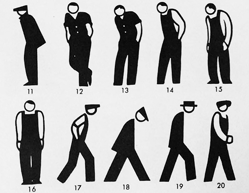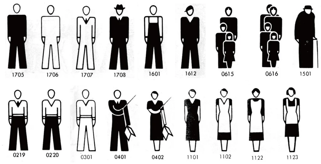 このように共同制作されたピクトグラムを使用しつつも、図像統計社は平行して独自にピクトグラムを制作したが、それらの基本形態には標準的ピクトグラムと比較して微妙な調整が加えられていた。すなわち、標準的ピクトグラムの頭部が卵形の形状であるのに対して、新たなピクトグラムではほぼ正円で統一されている(図12)。この独自のピクトグラムの基本形態は、それとのつながりを保持しつつも図像統計社のピクトグラムの独自性を示している点で、事実上の同社のハウススタイルとなっている。