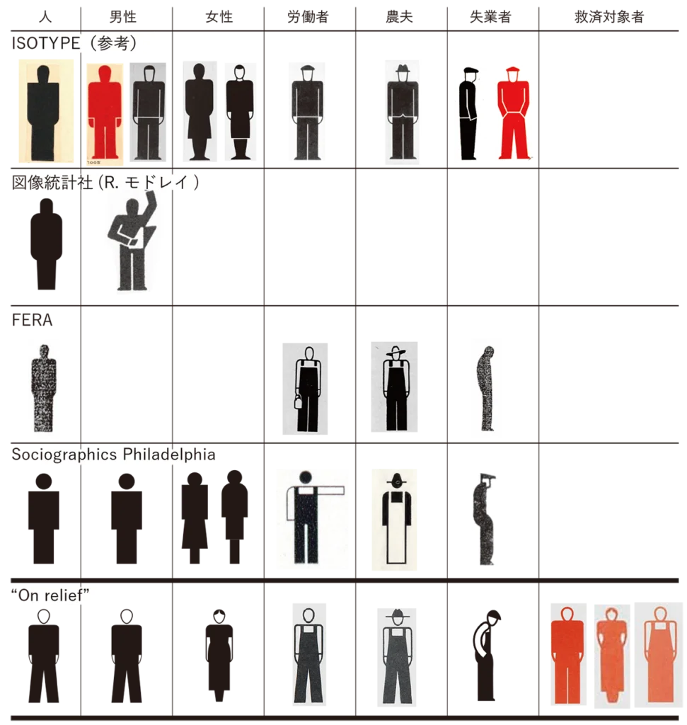 『支援』で出現したピクトグラムの特徴を把握するために、『支援』以前に3つの組織が使用してきた主立った人型ピクトグラムと『支援』のそれらを比較した一覧を作成した(図9)。まず、アイソタイプとの関係について確認する。1933年までの段階で制作されていた図像統計社設立以前のモドレイのピクトグラムやFERAのピクトグラムでは、頭部と胴体がつながっていること、非幾何学的シルエットで構成されていることから、アイソタイプの強い影響がうかがえる。反対に、SOPのピクトグラムについては当初から強い幾何学的特徴が一貫して認められ、1934年当初からアイソタイプとは異なる様式を目指していたことが分かる。